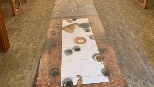 Påskedugen bliver rullet ud på kirkegulvet og her kan du følge beretningen om Jesu vandring fra palmesøndag til påskedag.